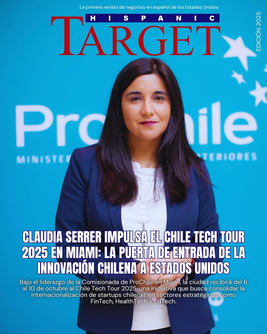Claudia Serrer en la portada de Hispanic Target Magazine: impulsa el Chile Tech Tour 2025 en Miami, la puerta de entrada de la innovación chilena a Estados Unidos