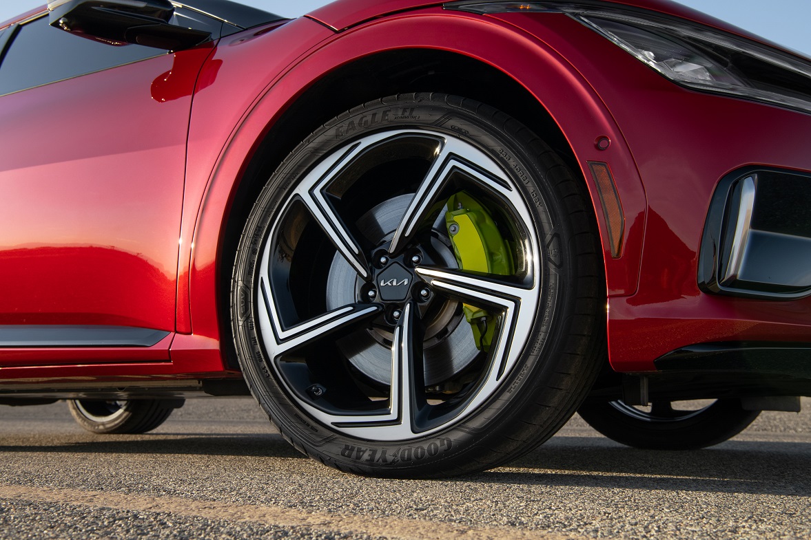 Los neumáticos Goodyear Eagle F1 con clasificación Z equipados con llantas de aleación de 21 pulgadas también son estándar en el EV6 GT.